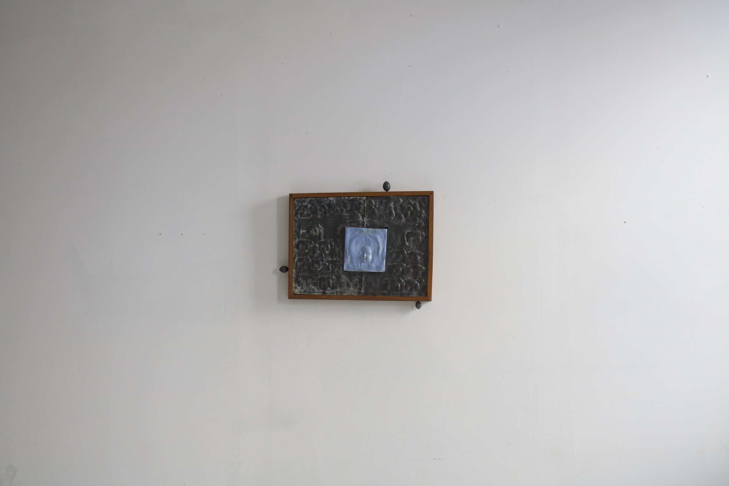 pigmented gypsum cement, beeswax, fishing weights, sapele