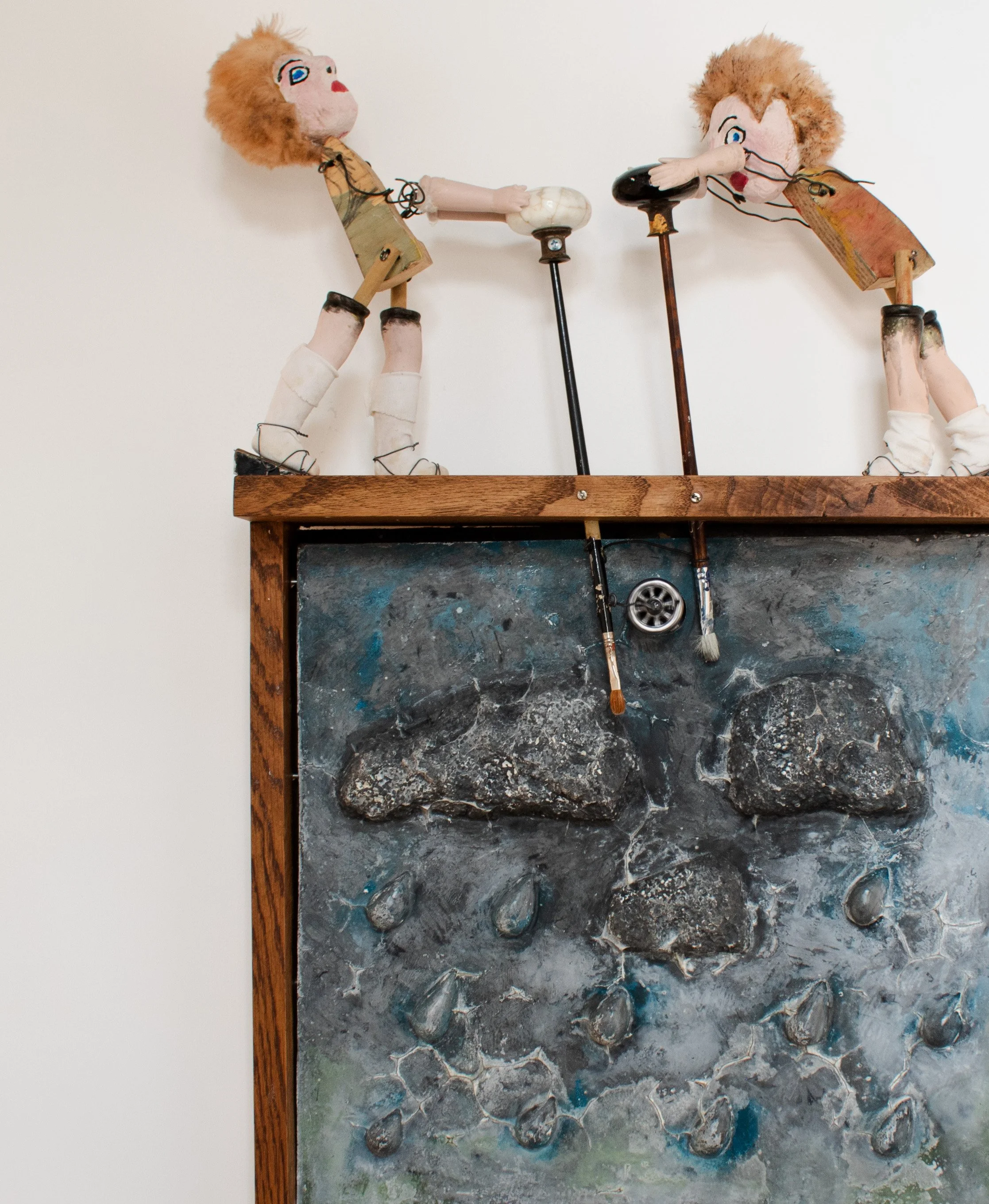 pigmented plaster, beeswax, walnut, wire, turntable motor, found objects (doll parts, door knobs, paint bushes, sheepskin)